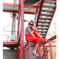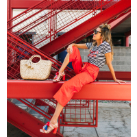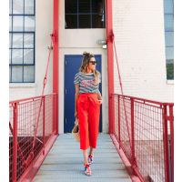 It’s a common joke in the house that when I get passionate about things I get really animated, move my hands around a lot, or raise my voice (when I’m not even mad). Or when we argue (yes we argue haha and it’s usually over really dumb things), Cody always teases me that I can get feisty and attributes it to my ‘spicy latin blood’ (I’m half Colombian – so when I saw this shirt I had to get it and it looks even better in person. I love the intersection of a graphic tee with embellishment – how good are these tassels! I definitely haven’t been shying away from bright colors lately. I love these bold red Kate Spade pants and they are actually really versatile! I’ve already worn them multiple times. And the statement bow totally makes them unique and a statement piece. And of course the shoes! I never shy away from pom poms!! Obsessed with these sandals!